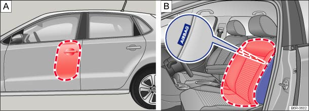 The side airbags are located in the outer seat backrest cushions of the driver seat and front passenger seat B. The locations of the airbags can be identified by the presence of stickers containing the word AIRBAG. The areas marked in red in show the side airbag deployment zones.